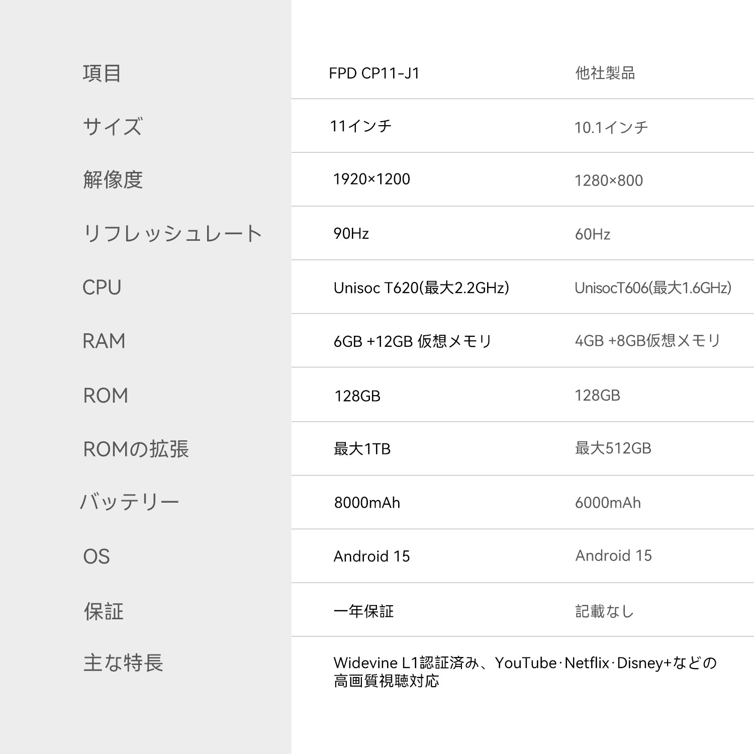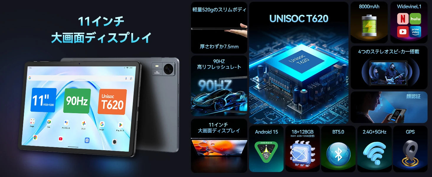 FPD タブレット 11インチ FHD+ Android 15 90Hz、1920x1200 IPS UNISOC T620 8コアCPU 18GB RAM+128GB+1TB拡張、8000mAh 大容量バッテリー 、Type-C 18W 急速充電 2.4G&5G Wi-Fi BT5.0 デュアルカメラ5MP+13MP+顔認識 GPS OTG Widevine L1対応