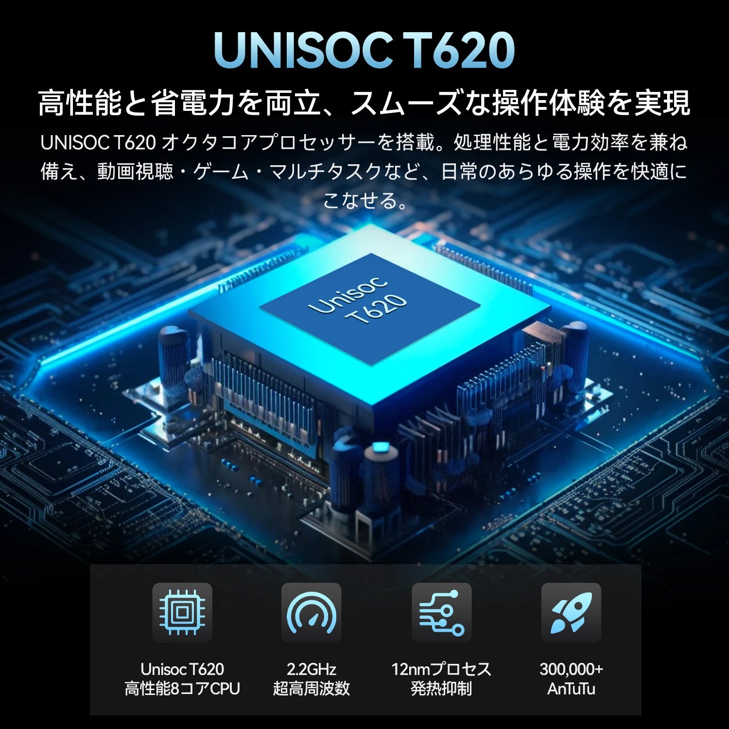 - 【高性能UNISOC T620 8コアCPU & Mali G57 GPU】2 つの高性能 A75 コアと 6 つの省電力 A55 コアが協調。最新の 12nm プロセス技術により、パフォーマンスとエネルギー効率のバランスが実現し、電池寿命の延長と発熱の抑制を両立。Mali-G57 GPUとの協働により、HD ビデオ再生やゲーム、日常アプリケーションでも滑らかで高品質なグラフィック表現を実現。没入感溢れるビジュアル体験をお楽しみいただけます。