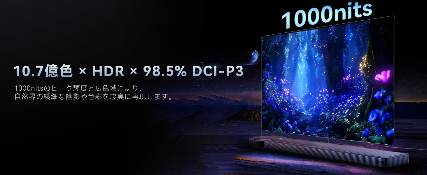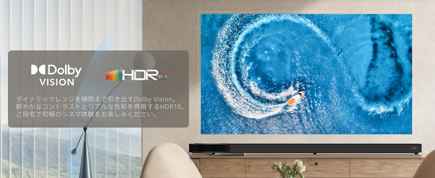 - 【臨場感あふれる映像】 4K UHD解像度、Dolby Vision、HDR10に対応し、1,500,000:1のコントラスト比と98.5% DCI-P3カバー率によって、深い黒と鮮やかな色彩を忠実に再現。1000nitsの高輝度で昼間の明るい部屋でも鮮明に映ります。