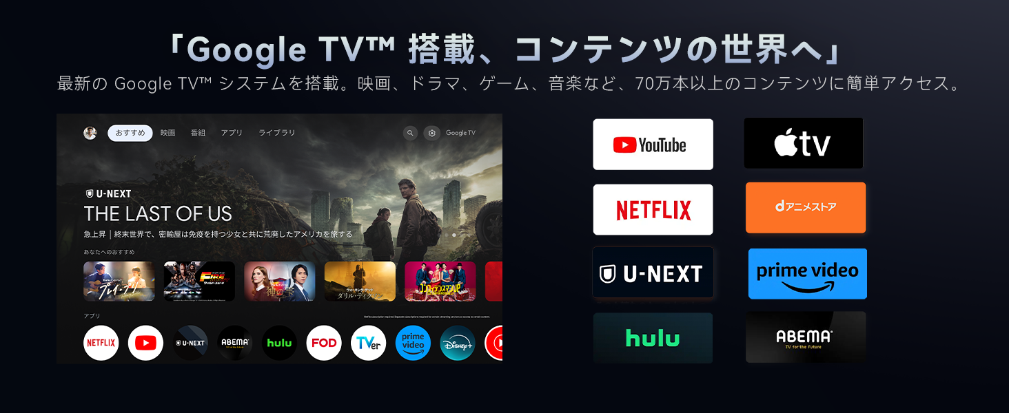 - 【Google TV搭載】 NETFLIX、Prime Video、YouTube、Disney+などの人気アプリをプリインストール。さらにGoogle Playからアプリやゲームを追加でき、多彩なコンテンツを自由に楽しめます。音声検索対応で操作もスムーズ。