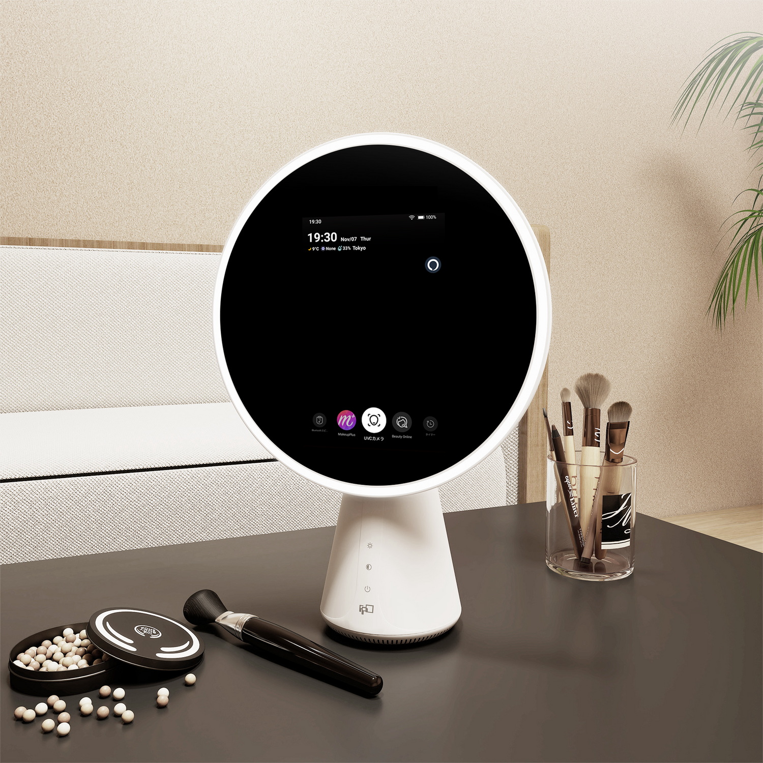 FPD 卓上スマートミラー 化粧鏡 APP肌診断 ARメイク試着 オンラインメイク学習 明るさ&色温度調整 磁気5倍拡大鏡&カメラ 音声アシスタント Wi-Fi接続 LEDタッチスクリーン対応
